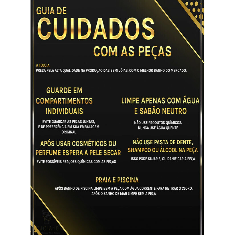 Oferecemos 180 dias de garantia contra defeitos no banho. Caso precise devolver, você tem até 7 dias após o recebimento. Recomendamos sempre higienizar e guardar corretamente para prolongar a vida útil da sua joia.